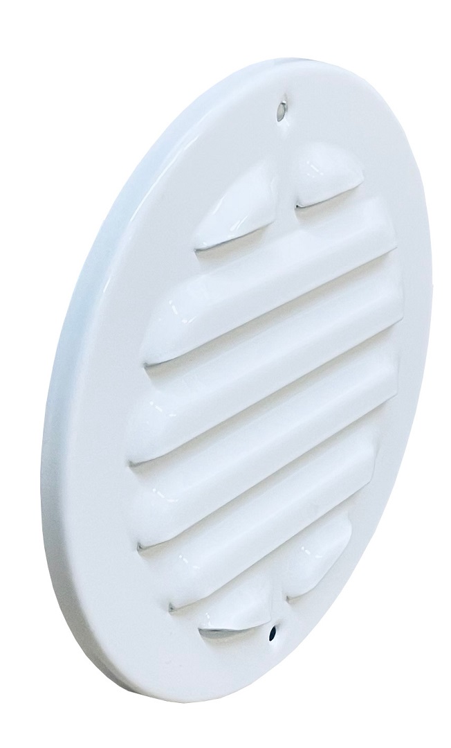 Lüftungsgitter Aluminium in runder Ausführung. Das Gitter ist Regeneinschlagfrei und kann dadurch im Außenbereich zur Wandmontage eingesetzt werden. Hochwertige Ausführung mit feiner Kiemenführung und Beschichtung.