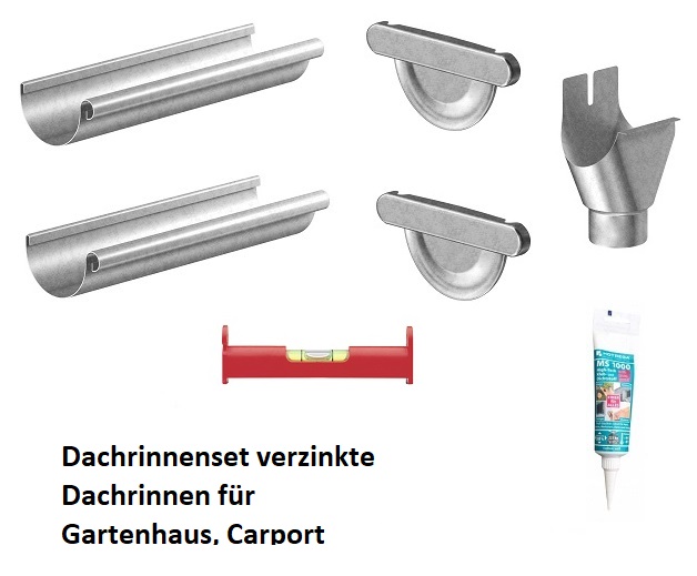 Dachrinnen Set NW 80 verzinkt, 2 Dachrinnen, 2 Endstücke, 1 Ablaufstutzen, Kleber, Schnurwasserwaage